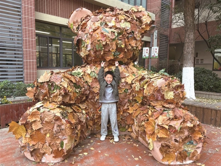 去年冬天,一只用梧桐葉拼成的“落葉貓”萌翻了通城人的朋友圈。今年,啟秀市北小學把一只“落葉熊”請進校園,給全校師生帶來了冬日里的專屬溫暖。這只“落葉熊”高2.5米、寬1.5米,是特意定制而成的泡沫熊,已經(jīng)在教學樓間的庭院里“安了家”。