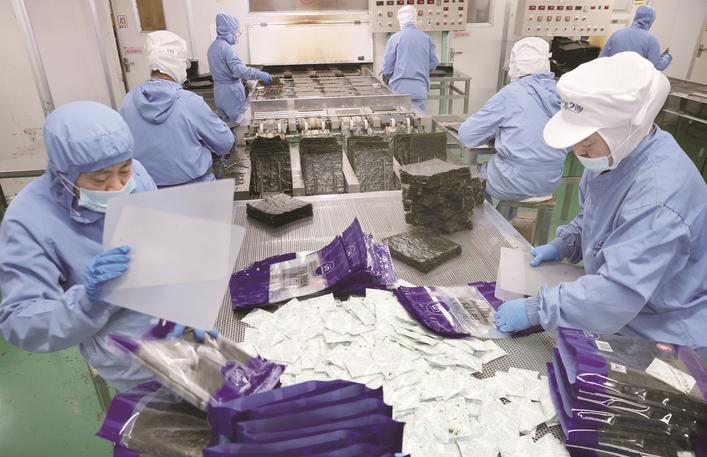 9日,工人在江蘇鮮之源水產(chǎn)食品有限公司生產(chǎn)車間加工紫菜。如東條斑紫菜總養(yǎng)殖面積約8萬畝,年產(chǎn)值超10億元。記者 許叢軍攝