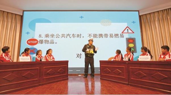 昨天,交警在向?qū)W生解答交通安全知識(shí)競(jìng)答題。