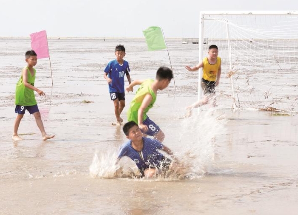 來自常州、泰州、揚(yáng)州等全省8個(gè)城市的100名青少年足球健兒在3天的賽程中挑戰(zhàn)獨(dú)特的灘涂競技,充分享受了泥潭中奔跑的酣暢淋漓。