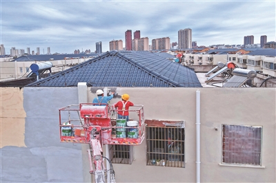 昨日,在如皋市如城街道,工人正在對(duì)皋南新村四組團(tuán)老舊小區(qū)居民樓立面墻進(jìn)行施工作業(yè)。近年來(lái),如皋市在推進(jìn)城市更新行動(dòng)中,通過(guò)對(duì)老舊小區(qū)管網(wǎng)系統(tǒng)、環(huán)境綠化等改造完善,不斷提升群眾居住幸福指數(shù)。