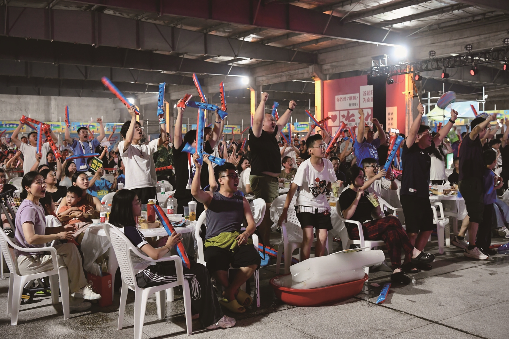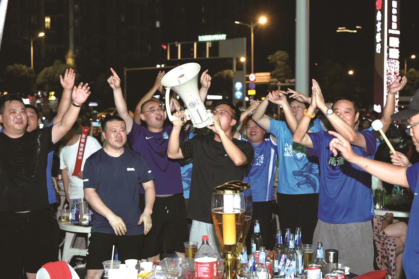 “蘇超”聯(lián)賽第二現(xiàn)場球迷為南通隊進球而歡呼