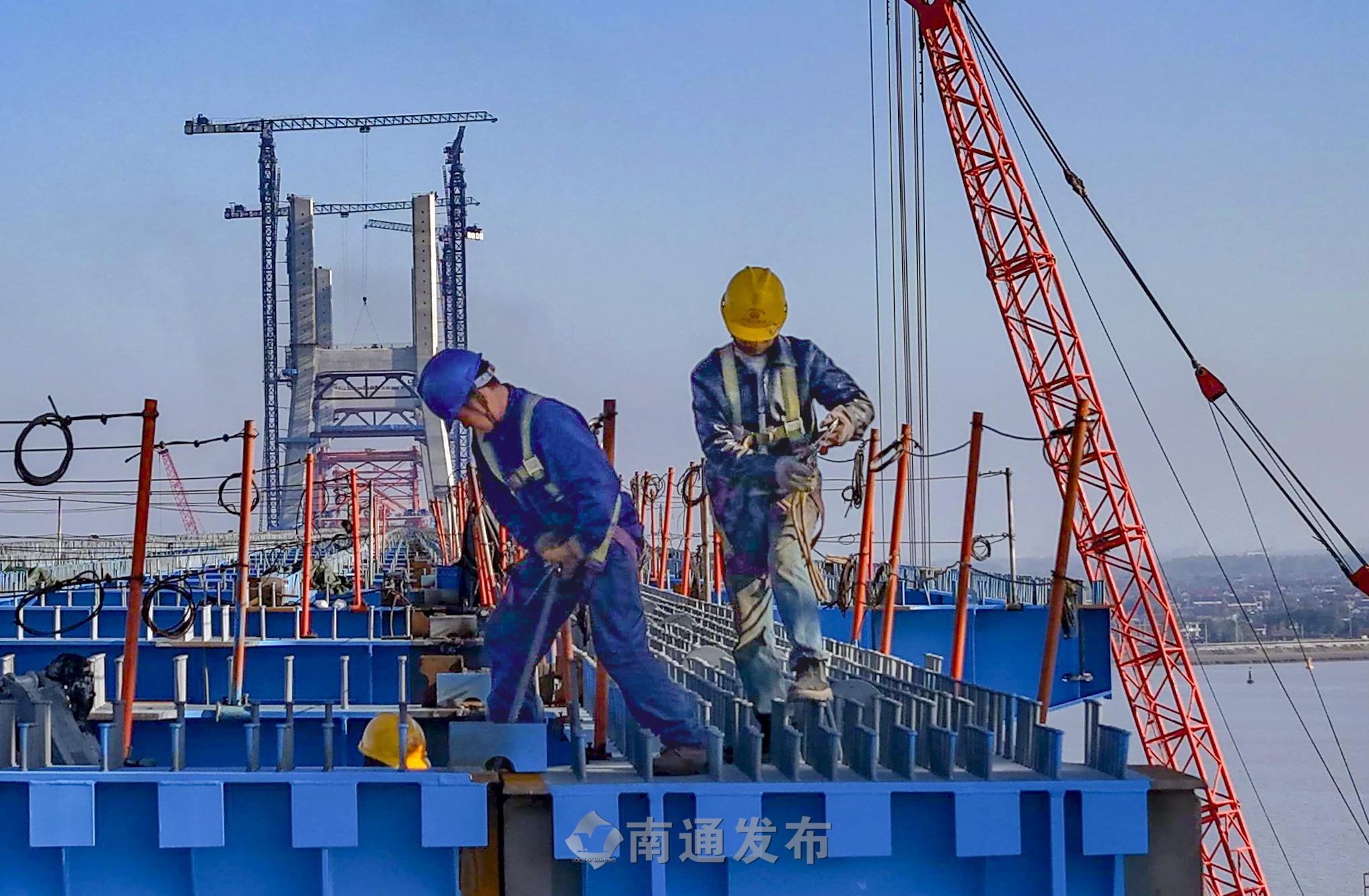 現(xiàn)場負(fù)責(zé)人張曉波介紹,此次吊裝組拼完成的是非通航孔最后一根公路橫梁。鋼桁梁由工廠制造,水路運(yùn)輸至橋位處碼頭,去年6月6日開始在大橋南岸鋼梁預(yù)拼場吊裝組拼。非通航孔橋鋼梁公路橫梁吊裝組拼全部完成為最后一輪頂推和后續(xù)與主通航孔鋼梁“會(huì)合”以及公路橋面板安裝等施工創(chuàng)造了有利條件。