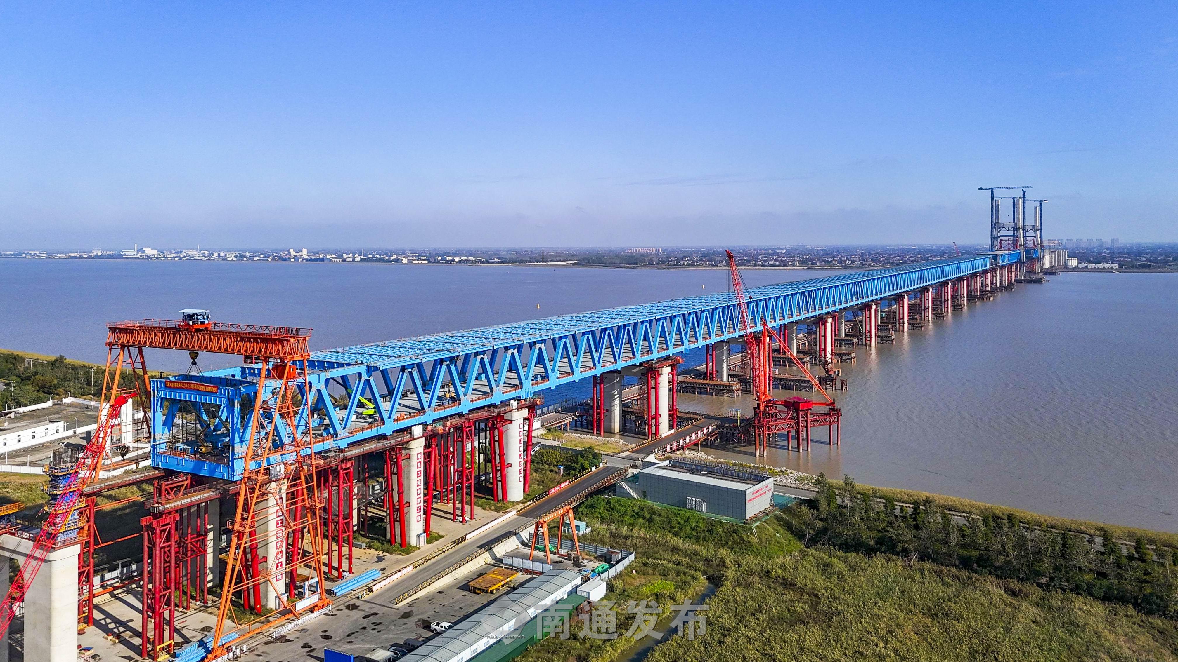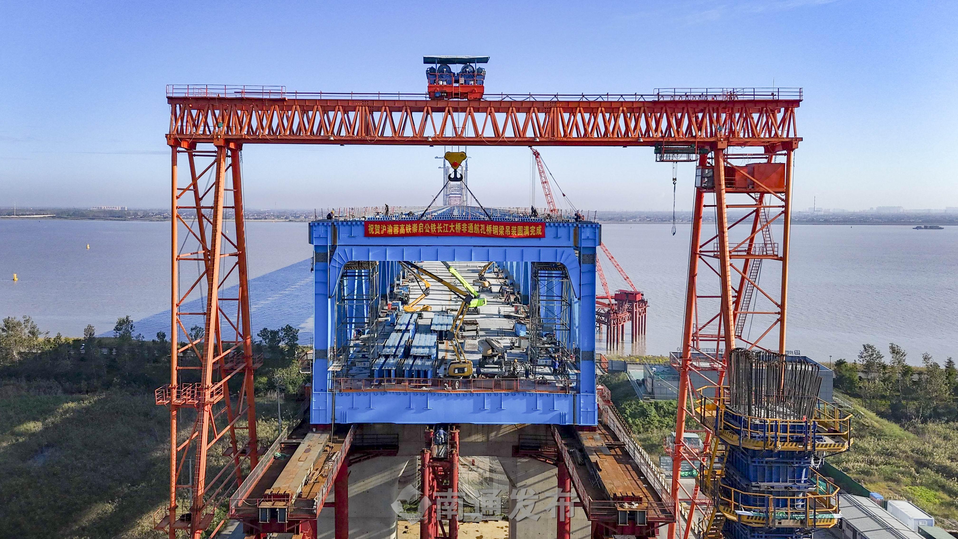 崇啟公鐵長江大橋是上海至南京至合肥高鐵控制性節(jié)點(diǎn)工程,全長4.09公里,橫跨長江入??诒敝Ш降溃鞘澜缱畲罂缍入p塔雙索面公鐵兩用無砟軌道斜拉橋,也是長江上時(shí)速最快的公鐵兩用斜拉橋。項(xiàng)目建成后,在上海大都市圈、南京都市圈和合肥都市圈間建起一條快速新通道,對于優(yōu)化沿長江地區(qū)鐵路網(wǎng)布局、服務(wù)長江經(jīng)濟(jì)帶協(xié)同發(fā)展,推動(dòng)長三角高質(zhì)量一體化發(fā)展等具有重要意義。